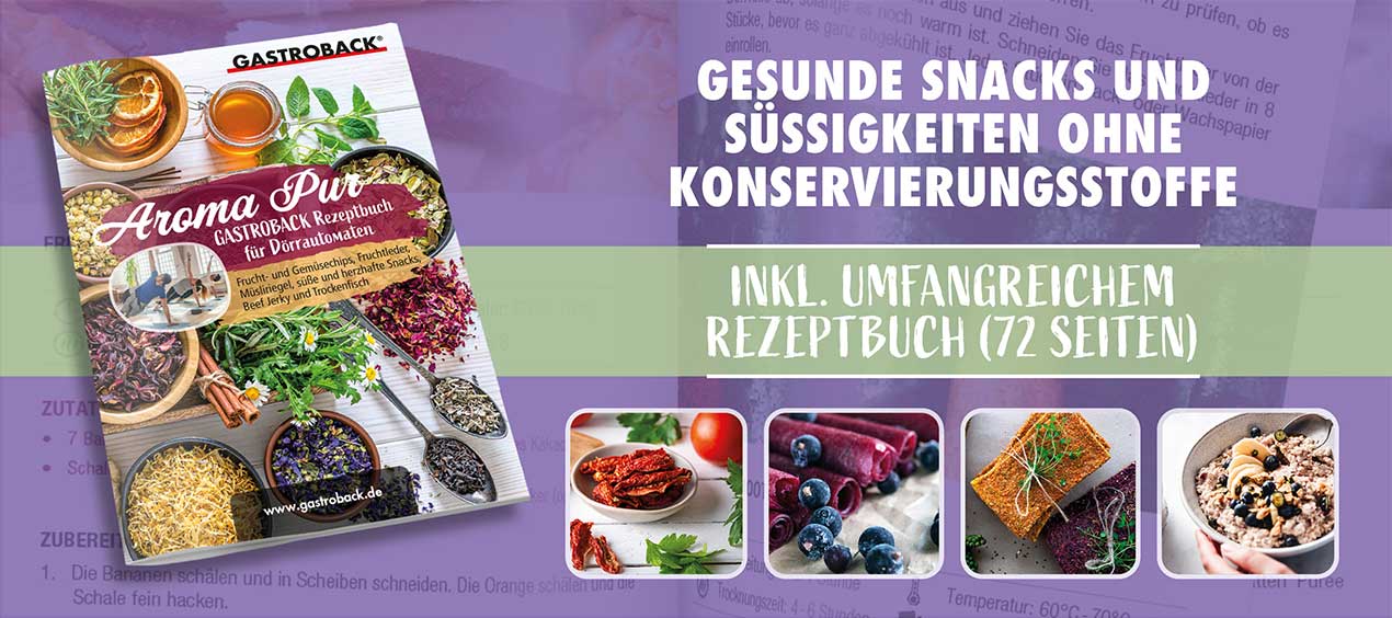 - Inklusive umfangreichem Rezeptbuch (72 Seiten) für Frucht- und Gemüsechips, Fruchtleder, Müsliriegel, süße und herzhafte Snacks, Beef Jerky und Trockenfisch